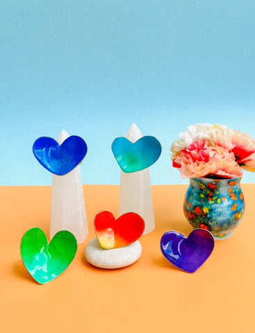 Slightly adjustable, Powdered patinas all sealed over a brass hand made heart shaped ring.